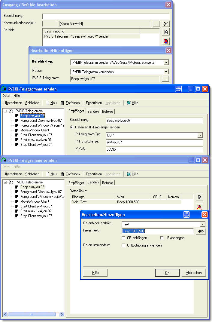 Beispiel: GetFile "D:\\Daten\\Werte.txt" Der Inhalt der Datei kann mit "IP/EIB Telegramm empfangen", Typ=UDP, Port=55595 ausgewertet, bzw. in Kommunikationsobjekten zur Verfügung gestellt werden. |
