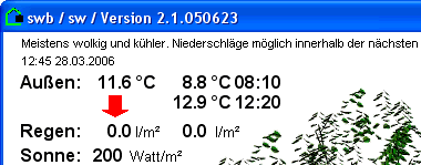 Beispiel: Pollfile "C:\\Wetterdaten\\eib.txt" 300 Achtung: Die angegebene Datei wird nach der Verarbeitung gelöscht !!!" Es wird alle 60 Sekunden geprüft ob die Datei vorhanden ist, ist die Datei nach den angegebenen Sekunden (in diesem Beispiel 300) nicht vorhanden, dann wird an den Port 56000 eine "1" gesendet, nach weiteren 300 Sekunden eine "2", u.s.w. Konnte die Datei nach der angegebenen Zeit verarbeitet, dann wird an den Port 56000 eine "0" gesendet. (Ich verwende diesen Funktion für die Rechnerüberwachung, erhalte ich mehrmals einen Fehler, dann starte ich den Rechner über die swHSexit-Funktion "Reboot" neu.) Der Inhalt der Datei muss einen bestimmten Aufbau haben, nachfolgend ein Beispiel: P56001:12:45 28.03.2006 P56002:11.6 P56003:8.8 P56004:08:10 P56005:12.9 P56006:12:20 P56011:0.0 P56012:0.0 Solarwert P56015:200 P56099:Meistens wolkig und kühler. Niederschläge möglich innerhalb der nächsten... Es werden nur Zeilen bearbeitet, die an erster Stelle ein "P" gefolgt von einer Port-Nr. zwischen 56001 und 56099 haben. Alle anderen Zeilen werden nicht verarbeitet, in diesem Beispiel die Zeile "Solarwert". Die Daten werden nur dann gesendet, wenn der Wert sich seit dem letzten Senden verändert hat, es wird zum Beispiel nur bei Temperaturänderung ein Telegramm gesendet. Nachfolgend von dem vorhergehenden Beispiel einen Ausschnitt aus meiner Visu:
