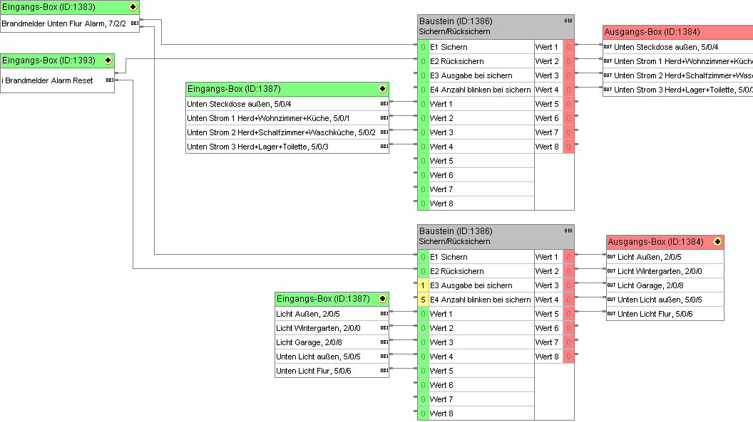 Gibt ein Brandmelder Alarm, dann sollen bestimmte Verbraucher ausgeschaltet und bestimmte Lampen eingeschaltet werden.