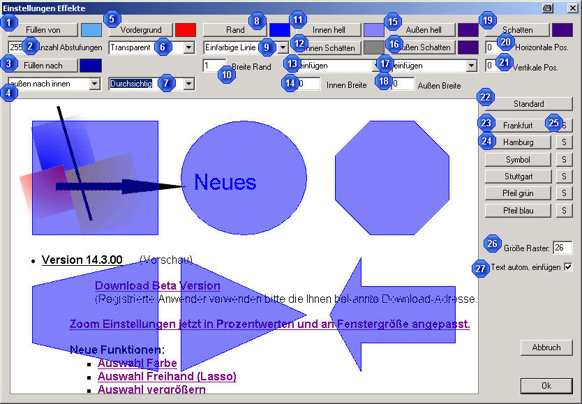 Eine Auswahl der Formen wid Ihnen im Menü Einstellungen Effekte zur besseren